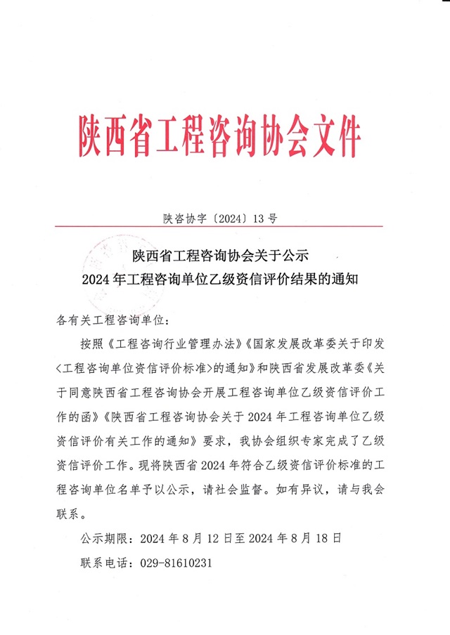 近日,陜西省工程咨詢協(xié)會發(fā)布《關(guān)于公示2024年工程咨詢單位乙級資信評價結(jié)果的通知》,我公司通過了陜西省2024年工程咨詢單位乙級資信評價。